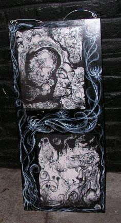 Anyone interested in this fine man's exposed-raw-nerve style artistry, is welcome to post me a note. I'll do my best to track him down. Spencer DOES have my phone number AND e-mail, BTW. It is quite likely he'll contact me soon. I couldn't pin him down as to OTHER specific locations where he hawks his recycled-wood canvasses. Just shrugged his shoulders, said "Dunno. I'm everywhere!"